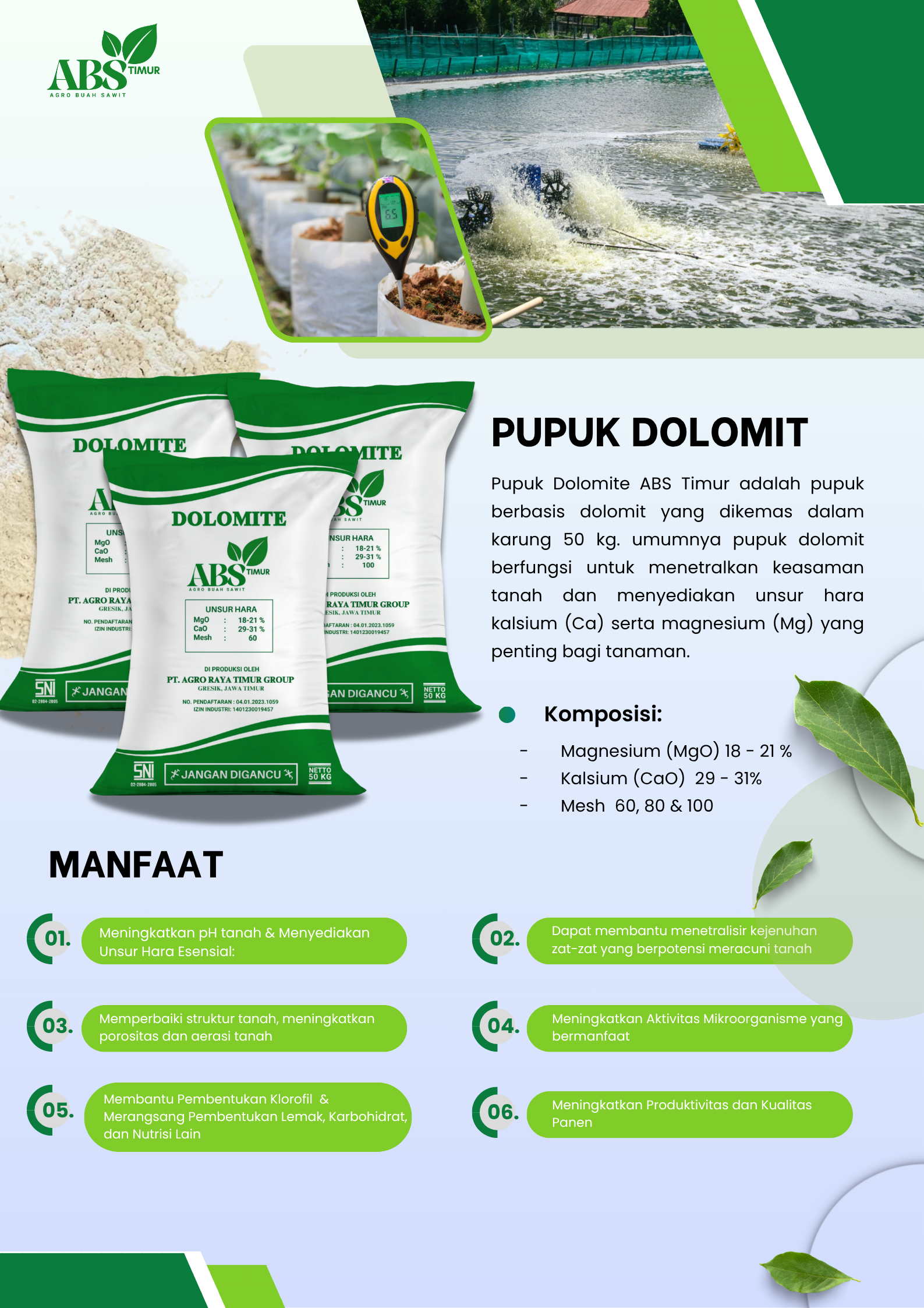 Pupuk Dolomite ABS Timur adalah pupuk berbasis dolomit yang dikemas dalam karung 50 kg. umumnya pupuk dolomit berfungsi untuk menetralkan keasaman tanah dan menyediakan unsur hara kalsium (Ca) serta magnesium (Mg) yang penting bagi tanaman.